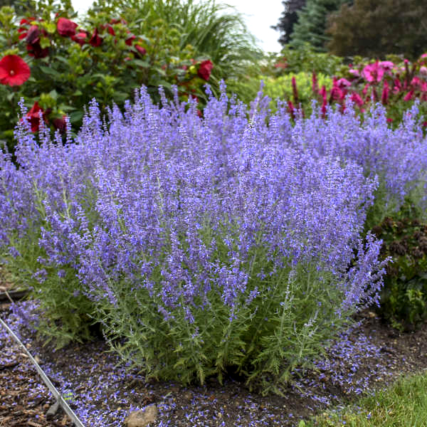 Sturdy, upright, shrub-like perennial with lovely, aromatic, lacey, silver-gray foliage. Produces masses of bright sky blue flowers held on closely spaced, amethyst calyxes. This closers spacing of the calyxes gives the plant a much fuller flowering appearance than other varieties. Very long flowering from July to October. Perovskia prefers average to dry, well-drained soil in full sun. Drought tolerant and dislikes winter wetness. In fall, spent flower spikes can be pruned off for a tidier appearance. Note: Perovskia should not be pruned too far back until new growth emerges in spring. Once new growth appears, prune back no lower than 30cm. HEIGHT: 60-70 cm SPREAD: 50-60 cm